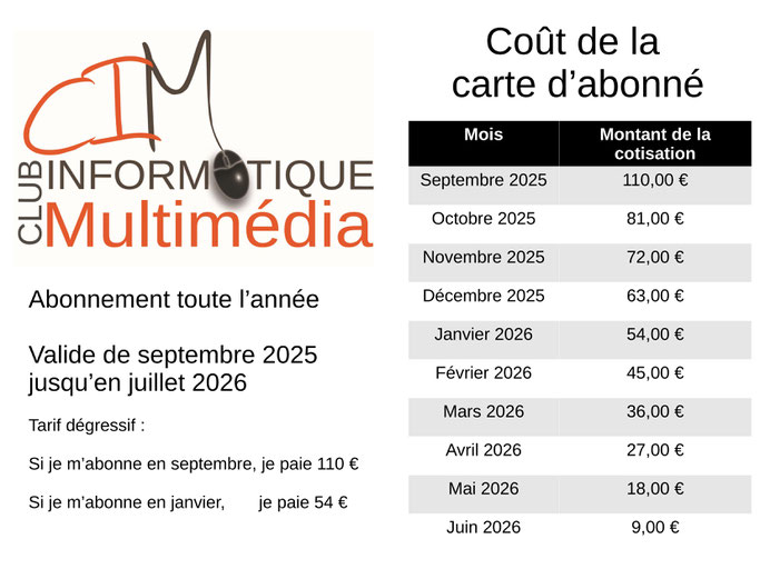 Exemple : si l'inscription est en janvier 2026, le montant sera de 54 € de janvier 2026 à fin juin 2026